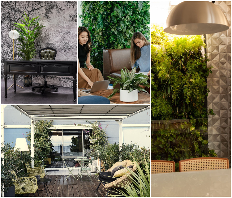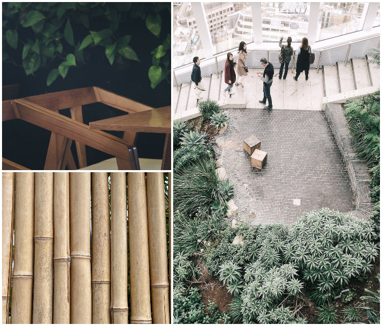 Niezbędnik prawdziwie biofilnego wnętrza. Królestwo roślin w ilości odczuwalnej, imponującej, przyciągającej. Roślinami aranżuje się całe strefy od zielonych ścian i sufitów po całe obszary adaptowanych pod nasadzenia podłóg. Firmowe hole, patio, tarasy a także specjalne pomieszczenia z fontannami, tropikalnym gąszczem i akompaniamentem śpiewu ptaków sprawiają, że słowa: „Idę do pracy” brzmią wyjątkowo radośnie.