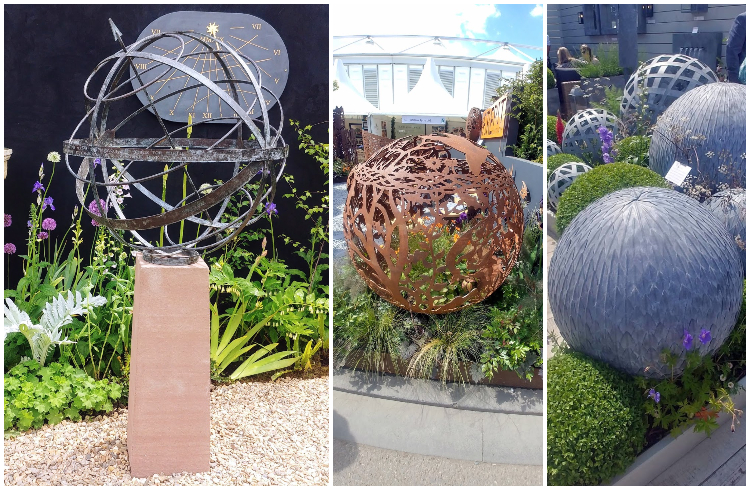 Oczywiście wyższe sfery. Kule nawiązują do ogrodów formalnych angielskich, do strzyżonych bukszpanów i geometryzacji. Ciekawą, klasycyzującą propozycją jest ogrodowe astrolabium – pod warunkiem, że działa naprawdę, a nie jedynie wygląda odpowiednio. Ażurowe kule kortenowe wyglądają szczególnie pięknie na bylinowych rabatach mieszanych, kiedy rośliny przerastają strukturę sferyczną.
